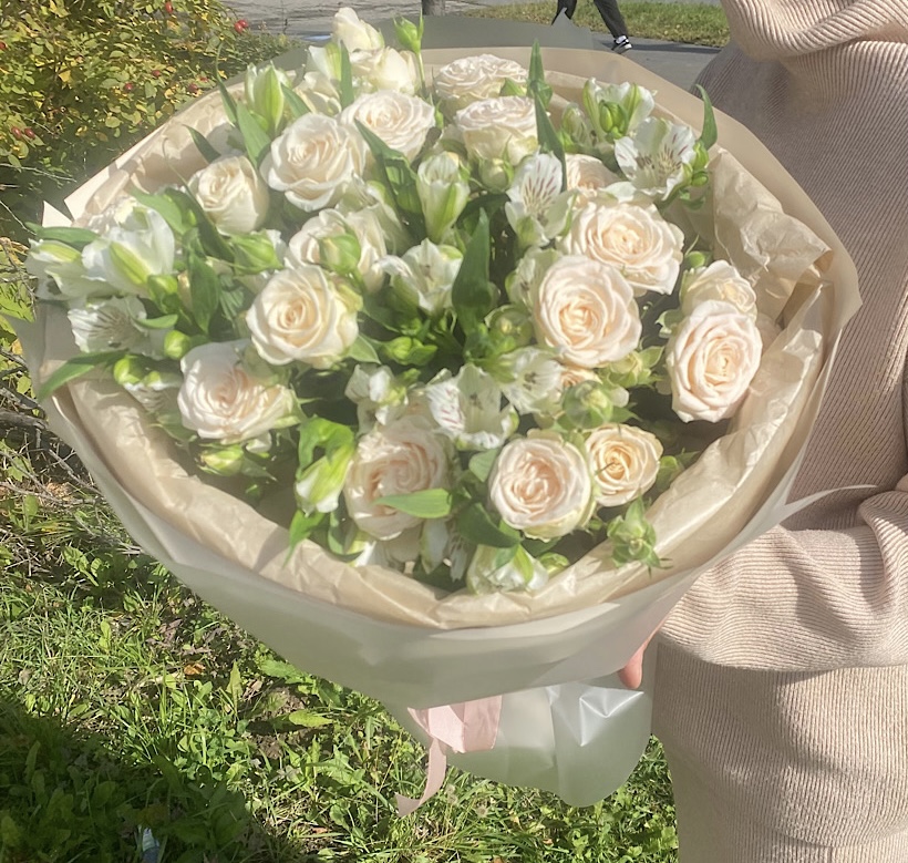 - Состав 5 Пионовидных кустовых роз Софи ,4 Альстромерии
